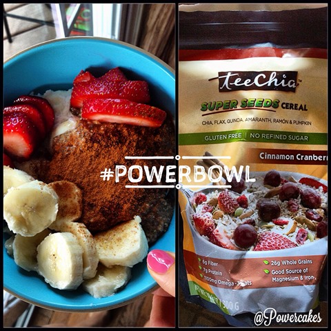 For breakfast I had some TeeChia super seeds cereal that I got from the IDEA World Convention. I heated some up with some water, added berries, bananas, & two poached eggs for some #POWERBOWL fuel for the day!