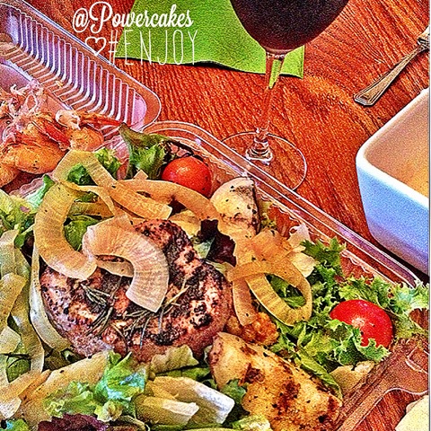 Dinner was take out from a local place. I got a huge tuna steak salad with grilled onions, russet potatoes, & candied walnuts! Also a side of OLD BAY (my favorite) shrimp & red wine. DELISH.