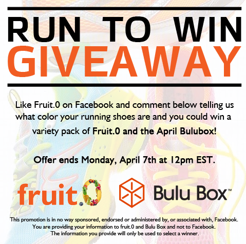 To be entered, you can head on over to give  Fruit.0  a like and comment below the image telling them what color your running shoes are and you could win a Bulu Box and variety pack of Fruit.0!