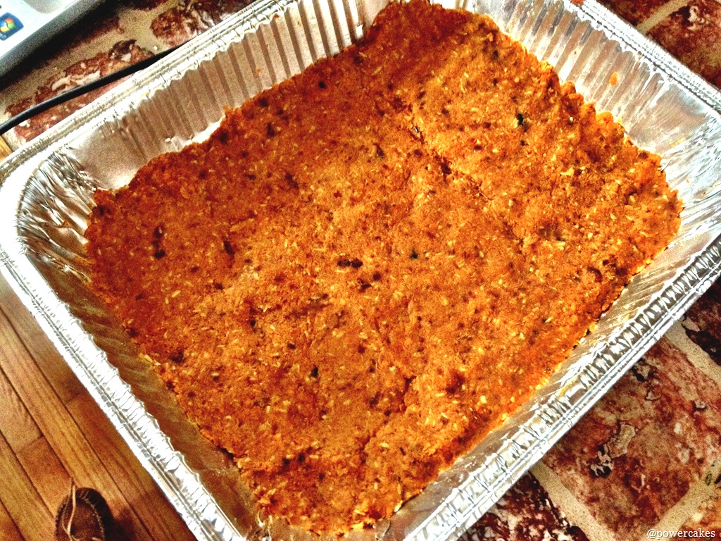I made my new version of Carrot Cake Date Balls (with added coconut flour) & instead of forming into ball shapes, I pressed the dough into the bottom of a foil pan.