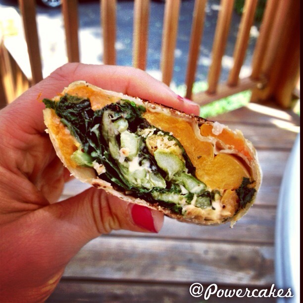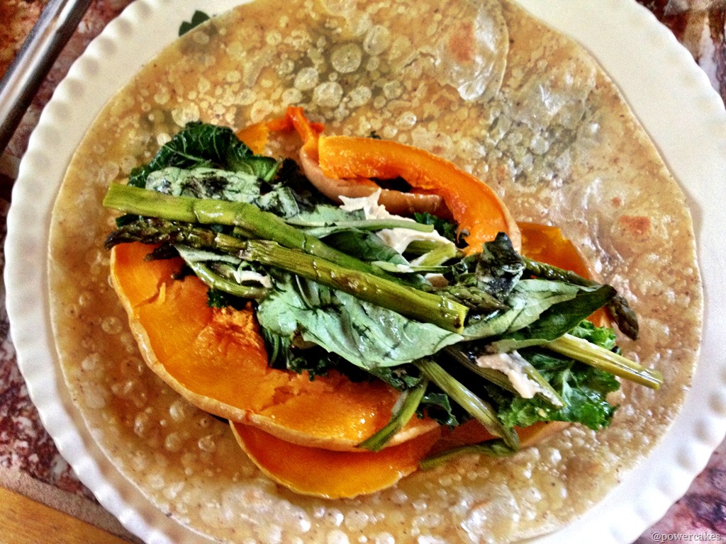 Once I got home, I had in my mind what I wanted to eat. Definitely wanted to get some good carbs in my body to fuel/repair those muscles. I saw a squash wrap the other day on [Pinterest] that inspired me to try one that is similar to my Creamy Kabocha Squash Collard Wrap. I opened my fridge to grab out different ingredients that I already had prepped waiting in the fridge & some brown rice wraps that I already bought – then magic was created.