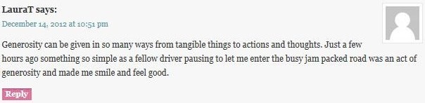 To enter the giveaway, I asked that you submitted a way you are being generous!