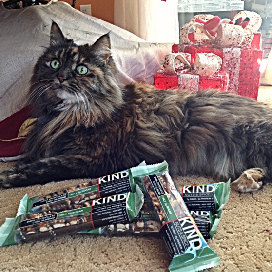 Even Abby cat liked them – she obviously tries to match her eye color to the types of bars she eats. And no, we didn’t feed her the bars but she did like playing with them under the tree. No need for expensive cat toys at our house – a foil ball or kind bars will do!