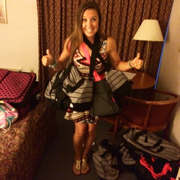 Katie, Heather, & I loaded up the Under Armour Swag Bags on every inch of our upper body so we could make an exciting (Ellen DeGeneres type) entrance with all of the goodies!