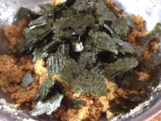 - Rip up your nori sheets into small 1 inch squares & add to your bowl of warm ingredients.