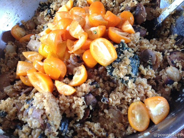 - Once quinoa & mushrooms are cooked, combine quinoa, mushrooms, & kumquats into a large bowl.