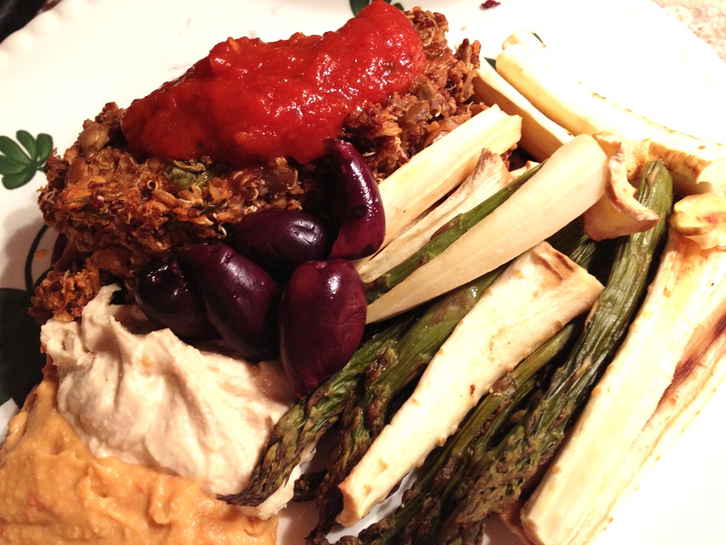 Serve the Lentil Loaf with hummus, asparagus, olives, & parsnip fries!