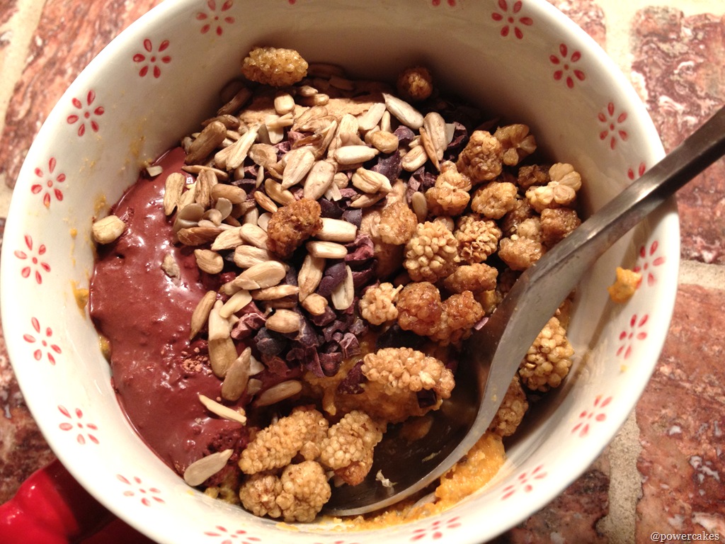 I had a BIG spoonful of sunflower seed butter, healthy chocolate sauce, mulberries, & PUMPKIN PIE CHIA PUDDING.