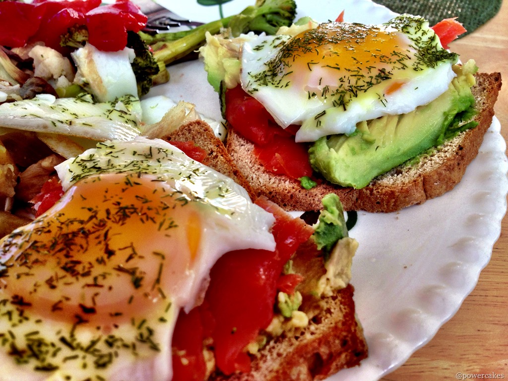 Julian Bakery Bread topped with avocado, red peppers, & two dippy eggs topped with dill with a side of veggies!