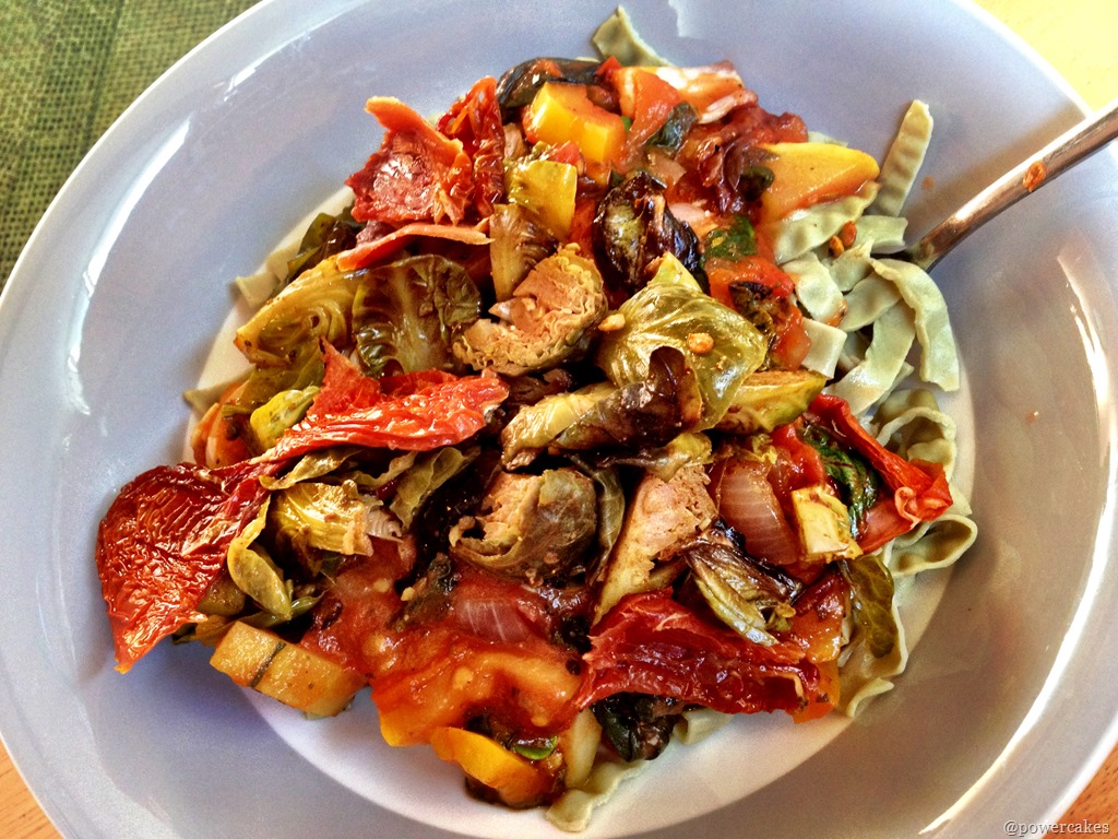 sundried tomatoes, roasted brussels, & organic tomato sauce.