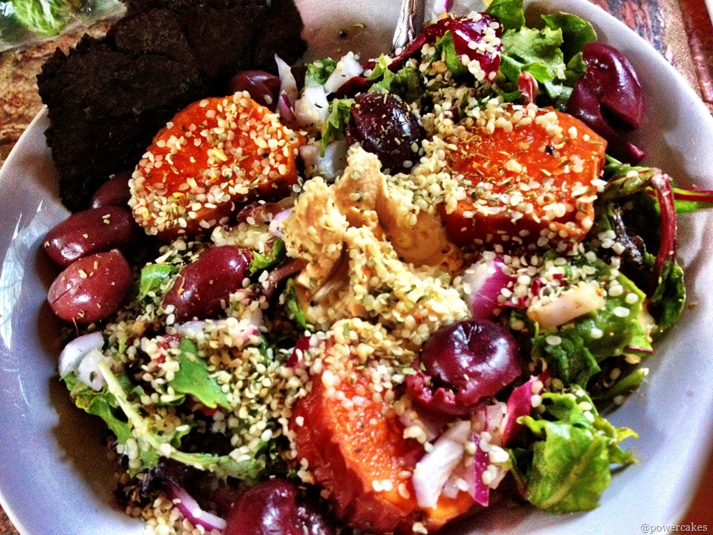 *Greens, olives, nori sheets, hemp seeds, hummus, red onion, & sweet potatoes.
