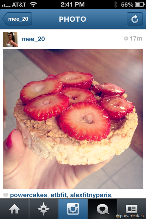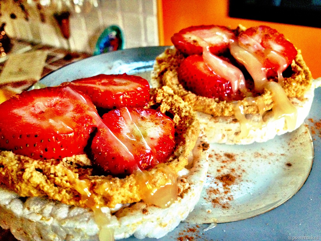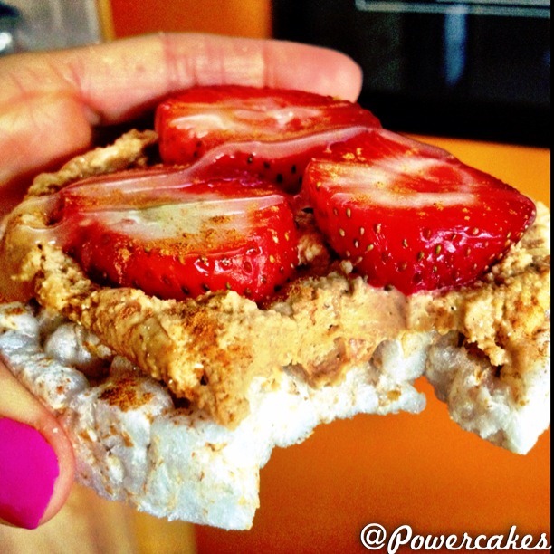 *Brown rice cake topped with peanut fluff (1/4 cup protein plus peanut flour (16g of protein!) mixed with a few TB of water until thick with a sprinkle of sea salt & dash of liquid stevia) topped with strawberries, & a drizzle of coconut nectar!